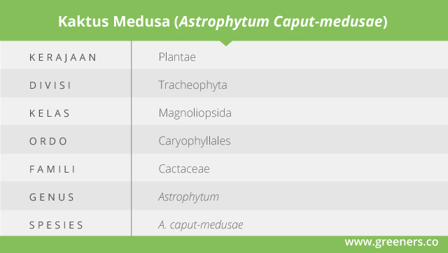 Kaktus medusa mempunyai nama ilmiah Astrophytum caput-medusae. Tanaman sukulen ini berasal dari sub-keluarga Cactoideae, sehingga tergolong ke dalam kelompok kaktus terbesar yang ada di dunia.