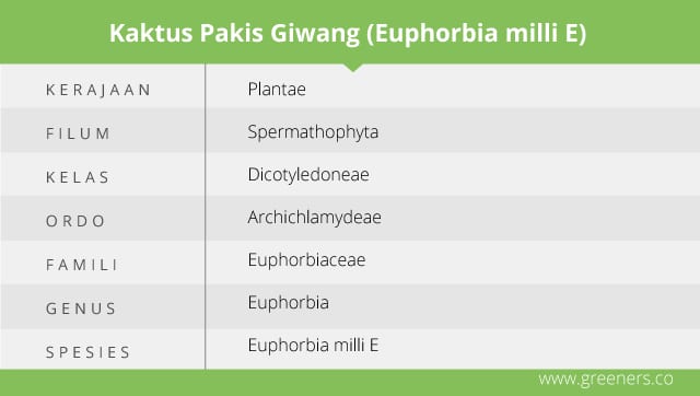 Kaktus Pakis Giwang atau Euphorbia millii E. dikenal sebagai tanaman hias yang dipelihara di dalam pot, pekarangan, dan taman. Beberapa di antaranya dimanfaatkan sebagai tanaman pagar. Kaktus ini dapat ditemukan di dataran rendah sampai ketinggian 2.300 meter di atas permukaan laut (Purwanto, 2006). Selain sebagai tumbuhan tahunan, kaktus juga tergolong semak tegak di atas tanah dengan tinggi dapat mencapai 40 sampai 180 sentimeter.