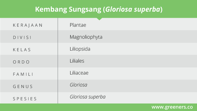 Kembang sungsang atau glory lily dikenal dengan nama ilmiah Gloriosa superba. Tanaman yang berasal dari famili Liliaceae ini memiliki beberapa nama ilmiah sinonim Gloriosa rothschildiana O’Brien, Gloriosa angulata Schumach, Gloriosa verschuurii Hoog, Methonica superba (L.) Crantz, Eugone superba (L.) Salisb.