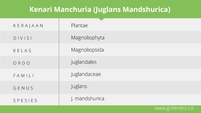 Kenari Manchuria mempunyai nama binomial Juglans mandshurica. Jenis pohon peluruh ini tergabung dalam keluarga Juglandaceae, sehingga berkerabat dengan spesies kenari hitam.