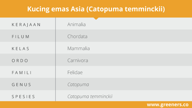 Terdapat dua spesies kucing emas dalam famili Felidae, yakni kucing emas asia (Catopuma temminckii) dan kucing emas afrika (Profelis aurata). Nama lain kucing emas asia adalah kucing Temminck. Satwa ini termasuk dalan famili Felidae dan berkerabat dengan kucing batu (Pardofelis marmorata), kucing pallas (Felis manul), harimau (Panthera tigris), puma (Puma concolor), dan lainnya.