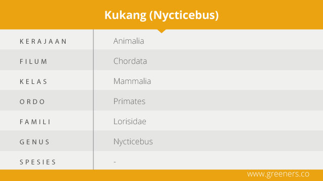 Ketiga spesies tersebut adalah Nycticebus coucang (Kukang Sumatra), Nycticebus menagensis (Kukang Kalimantan), dan Nycticebus javanicus (Kukang Jawa).