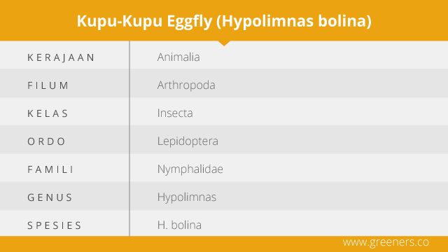 Great eggfly dikenal dengan nama ilmiah Hypolimnas bolina. Kupu-kupu ini tergabung dalam famili Nymphalidae, yang notabene-nya bisa kita kenali dari sepasang tungkai pendek pada bagian depan tubuhnya.