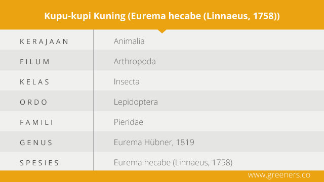 Kupu-kupu kuning, Eurema hecabe, sering dijumpai di pekarangan rumah. Helmiyetti dalam penelitian Purwowidodo (2015) jurusan ilmu biologi Universitas Islam Negeri Walisongo, menerangkan kupu-kupu kuning melimpah di banyak tempat. Bahkan, mereka terkadang disebut sebagai hama tanaman. Kupu-kupu kuning umumnya terbang lambat dan kadang tidak menentu, bahkan terbang selalu dekat dengan tanah.