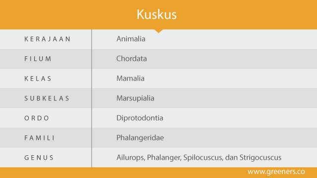 Kuskus adalah hewan endemik berkantung (tergolong marsupialia). Berdasarkan beberapa sumber, penyebaran kuskus tersebar hampir di seluruh Indonesia bagian timur. Hewan berkantung ini termasuk dalam famili Phalangeridae. Menurut para ahli, satwa ini digambarkan bertubuh agak besar dan kokoh, juga memiliki panjang seukuran ternak babi berumur dua bulan. Genus yang termasuk spesies kuskus yakni Ailurops, Phalanger, Spilocuscus, dan Strigocuscus. Pola pewarnaan bulu mereka pun dibedakan dalam dua genus, yaitu genus Spilocuscus dan Phalanger yang masing-masingnya terdiri dari 3 sampai 8 jenis.