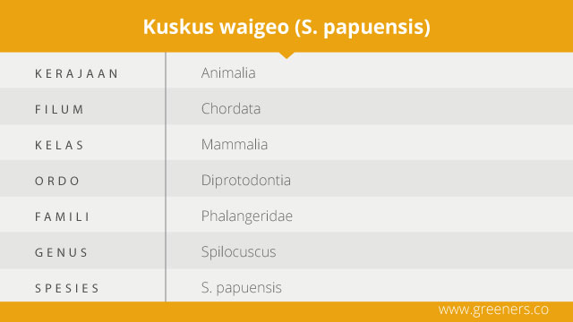 Baik kuskus Waigeo, tutul hitam dan biasa, semuanya memiliki DNA yang berbeda. Melalui Permen No.P.106/MENLHK/SETJEN/KUM.1/12/2018, ketiganya ahli identifikasi dengan nama ilmiah berbeda.