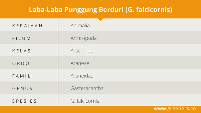 Seperti namanya, kelompok Gasteracantha dapat kita kenali dari duri di punggungnya. Laba-laba ini juga mempunyai corak serta warna yang indah, seperti halnya spesies G. falcicornis.