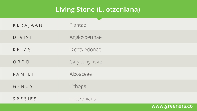 Living stone merupakan spesies tanaman sukulen yang tergabung ke dalam genus Lithops. Ia ahli kenal dengan nama ilmiah Lithops otzeniana, serta berasal dari keluarga Aizoaceae.