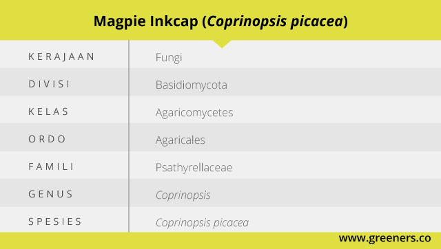 Penamaan genus Coprinopsis mengacu pada penampilan jamur ini yang mirip dengan genus Coprinus. Secara harfiah memiliki arti hidup di atas kotoran, sedangkan nama spesies picacea berasal dari nama ilmiah burung murai eurasia, Pica pica.
