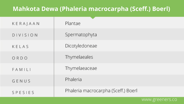 Tanaman ini juga dikenal dengan nama God’s Crown, simalakama, makutadewa, makuto rajo, makuto ratu, dan makuto mewo (Nur et al., 2014). Mahkota dewa merupakan pohon yang lengkap karena memiliki batang, daun, bunga, dan buah. Tingginya berkisar antara 118 meter dengan batang berwarna cokelat dan kayu berona putih. Umur produktif dari tanaman ini sekitar 10-20 tahun (Altaf et al., 2013).