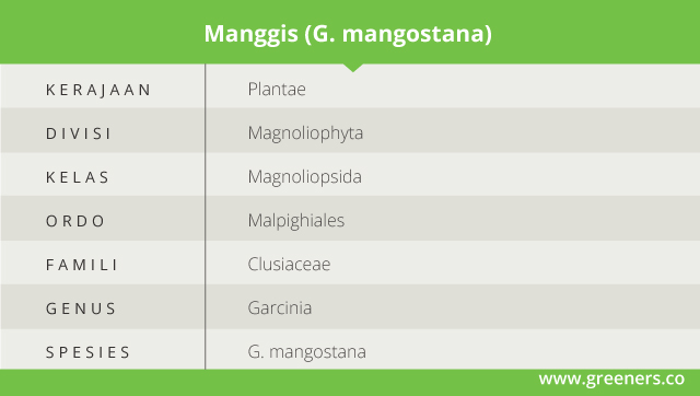Manggis mempunyai nama ilmiah Garcinia mangostana. Tumbuhan ini tergolong sebagai pohon hijau abadi, yang pakar sinyalir berasal dari Semenanjung Malaya serta Indonesia.
