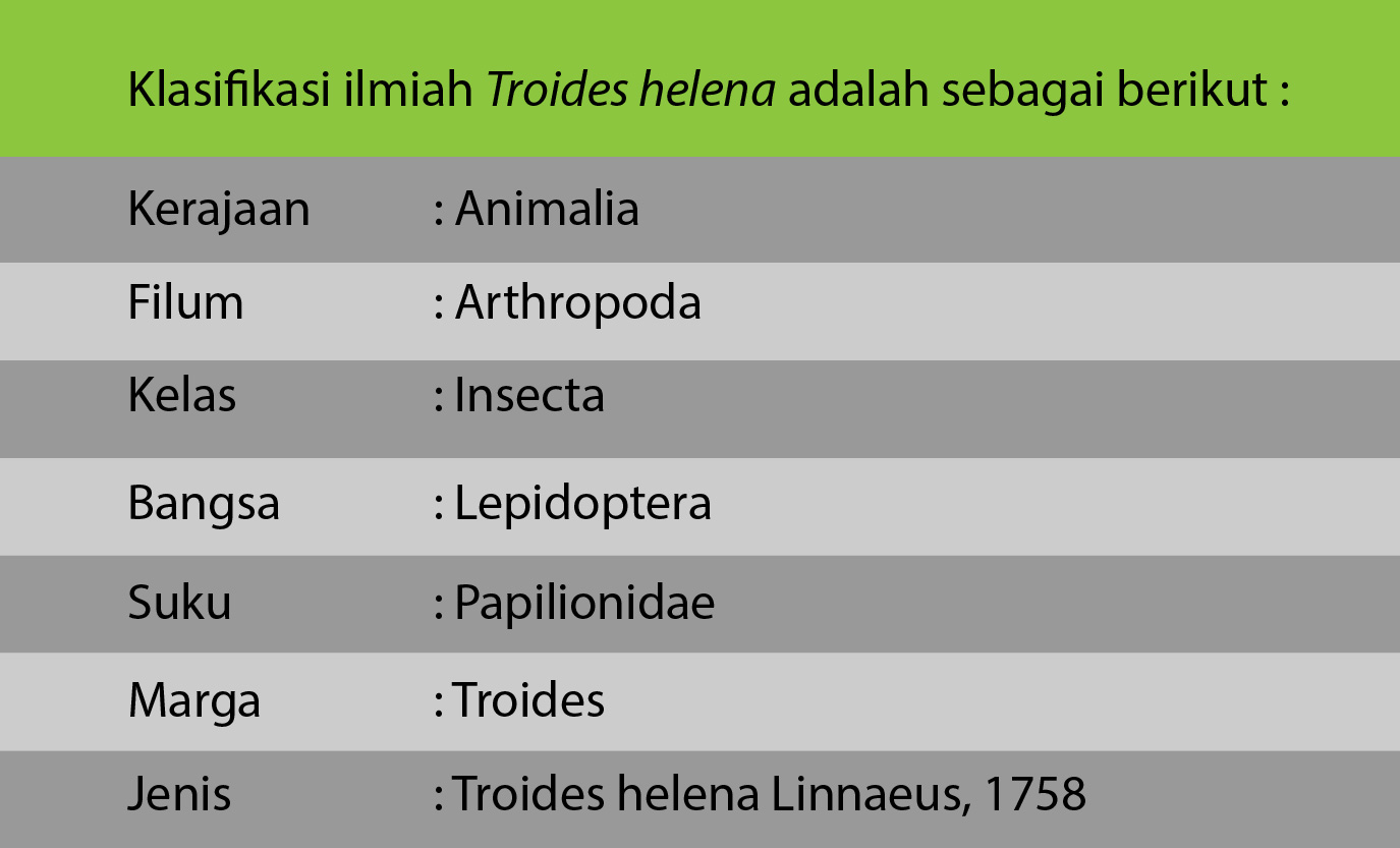 Troides helena atau Common Birdwing merupakan salah satu jenis kupu-kupu langka dan eksotik yang termasuk ke dalam keluarga Papilionidae. Jenis ini memiliki perpaduan warna pada sayap yang indah dan cantik. Hal ini menyebabkan keberadaannya di alam terancam dari tangan-tangan jahil kolektor yang ingin mengoleksinya dan dijadikan insectarium (figura yang berisi spesimen serangga) sebagai hiasan dinding. Selain itu, adanya kompetitor dan pemangsa di alam menyebabkan keberadaan Troides helena terancam punah.