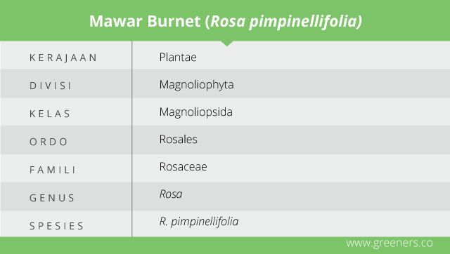 Genus Rosa dari famili Rosaceae memiliki lebih dari 150 spesies, terutama tersebar di Asia Barat, Anatolia, Afrika Barat Laut, Amerika Utara, Eropa Utara, dan Eropa Tengah. Salah satu spesies tersebut yaitu Rosa pimpinellifolia atau mawar burnet.