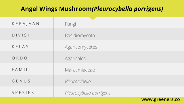 Jamur Pleurocybella porrigens atau Angel Wings Mushroom berasal dari famili Marasmiaceae yang terdiri dari 85 genus dan sekitar 1.600 spesies.