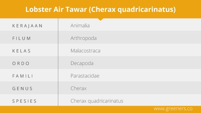 Lobster air tawar (Cherax quadricarinatus) termasuk ke dalam genus udang tawar (Crustacea). Selain sebagai konsumsi, fauna bercapit merah ini juga cocok dijadikan hewan hias karena memiliki keunggulan pada bentuk tubuh dan warna. Ia banyak dikembangkan untuk komoditi di dalam akuarium atau kolam. Karena ia tidak mudah stres dan terserang penyakit (Jurnal Sains Akuakultur Tropis, 2018).