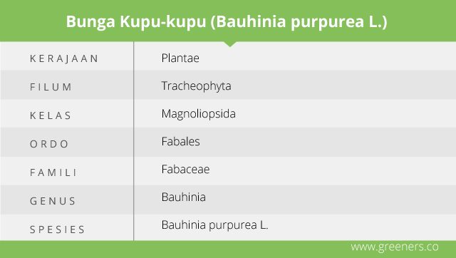 Nama kupu-kupu bukan hanya berlaku untuk hewan, tetapi juga tanaman. Bauhinia purpurea L. atau nama latin tanaman kupu-kupu merupakan tumbuhan yang banyak ditanam sebagai peneduh jalan dan penghijauan. Sekilas daunnya tampak seperti rangkaian bunga anggrek dengan kelopak berwarna pink keunguan.