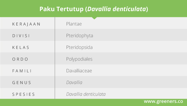 Berasal dari famili Davalliaceae yang terdiri dari satu genus yakni Davallia dan 90 spesies. Sekilas morfologinya terlihat mirip dengan paku jenis Davallia solida dan Davallia pyxidata.