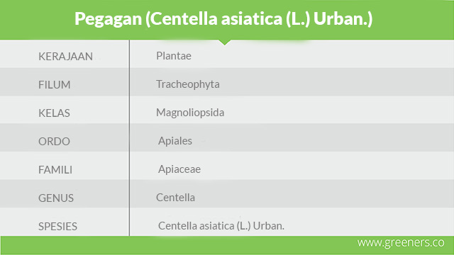Pegagan dikenal dengan nama latin Centella asiatica (L.) Urban atau Hydrocotyle asiatica Linn. Di Indonesia tumbuhan ini dikenal dengan berbagai macam nama sesuai dengan daerah tempat mereka tumbuh. Di Sunda dikenal sebagai antanan, di Sumatra disebut daun kaki kuda, di Madura disebut tikusan, di Jawa disebut gagan-gagan dan di Bali disebut piduh. Di Inggris pegagan dikenal dengan sebutan pennywort, sedangan di Amerika disebut gotu kola.