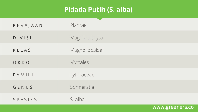 Pidada putih publik kenal juga sebagai perepat. Flora ini ahli golongkan sebagai bakau yang berasal dari keluarga Lythraceae, serta memiliki nama latin atau binomial Sonneratia alba.