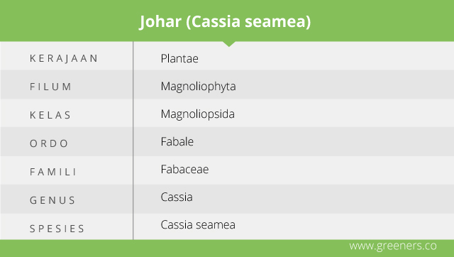 Nama ilmiah johar adalah Cassia siamea Lamk yang merujuk pada tanah asalnya, yakni Siam atau Thailand. Flora ini merupakan jenis tumbuhan asli Asia Tenggara yang tersebar mulai dari Indonesia hingga Sri Lanka (Suharnantono, 2011).