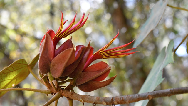 Sementara itu, bagian bunganya biasanya muncul saat akhir musim semi hingga awal musim panas (Mei-Juni). Bunga tersebut tampak seperti cakar merah dengan lima benang sari berukuran panjang 2,5 cm yang tampak seperti jari-jari yang menonjol dari cawan merah marun.