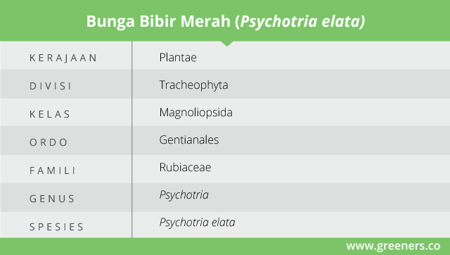 Tanaman berbunga bibir merah atau hot lips plant memiliki nama ilmiah Psychotria elata. Berasal dari famili Rubiaceae yang terdiri dari 611 genus dengan lebih dari 13.150 spesies herba, semak, dan pohon yang terdistribusi di daerah tropis.
