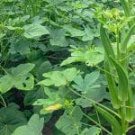 Buah pada bunga ini berbentuk kotak kerecut, berambut, terbagi menjadi 5 ruang, dan berwarna merah. Bentuk biji menyerupai ginjal, bebulu, dengan panjang 5 mm dan lebar 4 mm. Saat masih muda, bijinya berwarna putih dan setelah tua berubah menjadi abu-abu.