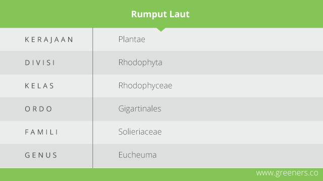 Rumput laut sendiri tidak memiliki akar, batang dan daun. Bentuk tubuh yang menyerupai akar, daun dan batangnya dinamakan thallus. Rumput laut terbagi ke dalam empat kelompok berdasarkan pigmen yang terkandung dalam rumput laut, yaitu Rhodophyceae (merah), Chlorophyceae (hijau), Phaeophyceae (coklat) dan Cyanophyceae (biru-hijau).