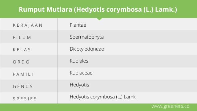 Rumput mutiara atau dalam penamaan latin disebut Hedyotis corymbose merupakan rumput liar yang banyak dijumpai di Indonesia. Rumput mutiara juga dikenal dengan nama lain, yaitu lidah ular. Dalam penamaan lokal, tanaman ini disebut juga sebagai katepan, urek-urek polo, lidah ular (Jawa), pengka (Makassar), dan bunga telor (Melayu) (Dalimartha, 2008).