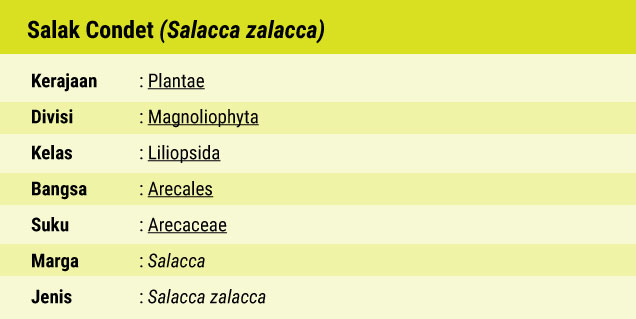 Pohon salak (Salacca zalacca) termasuk dalam keluarga Palmae, memiliki akar serabut dan perakarannya cukup dangkal, yaitu ± 1 meter pada permukaan tanah. Bagian pelepah batangnya penuh dengan duri, berduri halus pada kulit buahnya yang berwarna kehitaman atau kecoklatan, berbiji tunggal dan memiliki aroma buah yang khas.