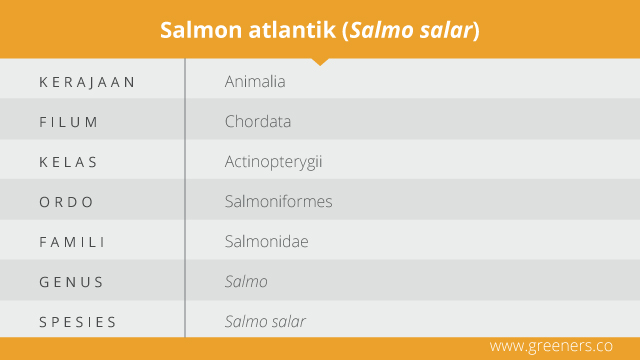 Berasal dari famili Salmonidae yang anggotanya berukuran tubuh relatif kecil. Ikan salmon genus Salmo yang dapat kita temukan di Atlantik Utara, sedangkan genus Oncorhynchus berada di Samudera Pasifik. Oleh karena itu, ikan salmon atlantik berkerabat dengan salmon cokelat (S. trutta), salmon pelangi (O. mykiss), The Chars (Salvelinus spp.), dan The Huchen (Hucho spp.)
