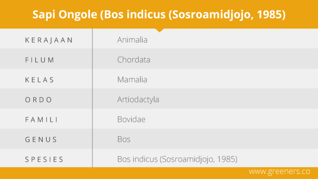 Sapi ongole (Bos indicus) mempunyai ciri-ciri fisik yaitu bewarna putih sedikit keabu–abuan, warna pada jantan lebih gelap daripada yang betina. Kepalanya panjang, telinganya kecil dan bergantung, ukuran tanduk sedang. Sapi ini bergelambir, tubuh besar, berpunuk di atas bahu, paha besar, serta kulit tebal. Ukuran punuk pada jantan lebih besar dari punuk betina.