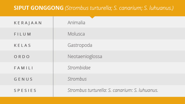 Pada karakteristik dan morfologinya, biota ini merupakan gastropoda laut famili Strombidae. Ada 3 jenis siput dari famili Strombidae yang disemati nama siput gonggong antara lain Strombus turturella, Strombus canarium, dan Strombus luhuanus.