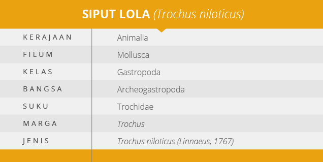 Perlindungan dan pelarangan perdagangan biota lola telah ada sejak Keputusan Menteri Kehutanan No. 12/KPTS II/1987. Meskipun lola merupakan biota yang dilindungi, akan tetapi perdagangan ilegal satwa laut ini masih terus berlangsung.
