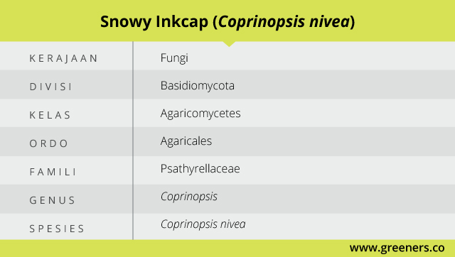 Semakin berkembangnya ilmu pengetahuan, hasil analisis DNA jamur di tahun 2001 mereduksi genus Coprinus menjadi beberapa spesies saja. Sehingga jamur snowy inkcap memiliki penamaan baru yang kita kenal hinga saat ini Coprinopsis nivea.
