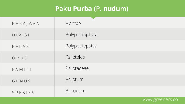 Psilotum nudum merupakan salah satu spesies paku purba yang sudah ada sejak 360 juta tahun silam. Tanaman ini ahli golongkan dalam keluarga Psilotaceae, sehingga berkerabat dekat dengan spesies paku Tmesipteris atau pakis gantung.