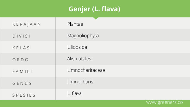Memiliki nama ilmiah Limnocharis flava, genjer ahli golongkan sebagai tumbuhan liar bersuku Alismataceae. Ia datang dari bangsa flora Alismatales, dengan karakteristik biji berkeping tunggal.