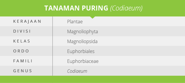 Anggota puring (Codiaeum) sebetulnya tidak banyak, berdasarkan laporan yang ada hanya terdapat antara 15-16 spesies. Keunikan yang terjadi adalah pada keanekaragaman bentuk daun dan warna yang sangat berlimpah, ada yang berbentuk bulat telur (ovatus), lonjong (oblongus), jorong (ellipticus), ada juga yang berbentuk pita (linear).