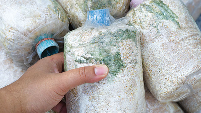 - Tunggu 5-15 hari sampai jamur berwarna putih, hijau atau biru keluar.
