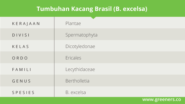 Kacang Brasil dikenal dengan nama latin Bertholletia excelsa. Flora ini dapat kita identifikasi dari ukurannya yang besar, salah satu yang terbesar di dunia, serta punya usia yang panjang.