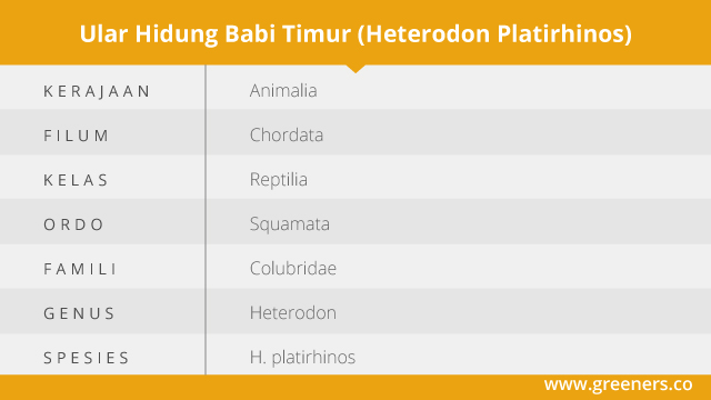 Jangan salah sangka, ular hidung babi timur sejatinya tergolong sebagai ular berbisa. Satwa ini tergabung ke dalam famili Colubridae dan genus Heterodon, sehingga memiliki nama ilmiah Heterodon platirhinos.