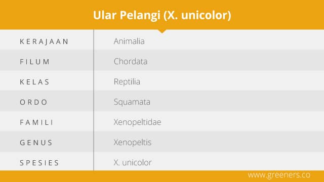 Salah satu ular yang terancam punah adalah Xenopeltis unicolor atau disebut ular pelangi. Disebut demikian karena warna tubuhnya coklat atau abu-abu dengan sisik yang licin dan berkilau memantulkan warna jika terkena cahaya matahari. Di Jawa Tengah, reptil ini dikenal dengan nama ular bawang sebab mengeluarkan aroma bawang putih jika dipegang.