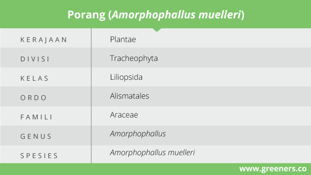 Tanaman porang (Amorphophallus muelleri) berasal dari famili Araceae yang pertama kali terpublikasi pada tahun 1837. Ada banyak nama ilmiah sinonim, di antaranya Amorphophallus burmanicus, Amorphophallus planus, Conophallus muelleri (Blume), dan Amorphophallus blumei.