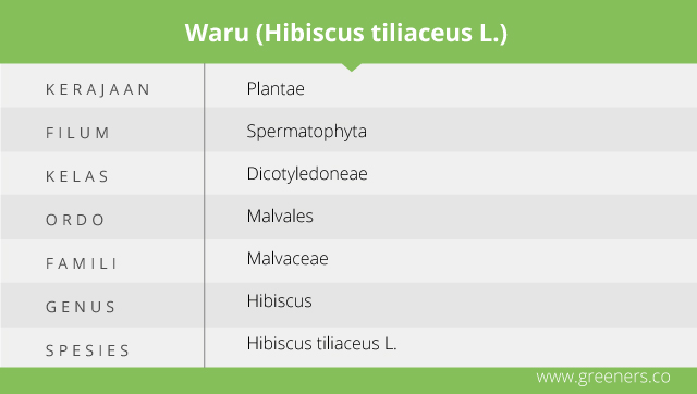 Pohon waru atau Hibiscus Tiliance L. termasuk ke dalam suku kapas-kapasan (Malvaceae). Tumbuhan tropis berbatang sedang ini bisa tumbuh di pinggir jalan maupun di dekat pesisir. Selain di kedua tempat tadi, jenis ini juga telah lama dikenal sebagai pohon peneduh di sungai dan pematang.