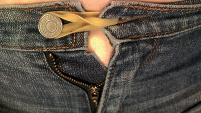 Pernah mengalami kejadian menyebalkan seperti menggunakan celana namun kancingnya tidak bisa dikaitkan? Hal tersebut bisa diatasi dengan karet gelang lho. Ambil sebuah karet gelang kemudian masukkan dalam lubang kancing. Setelah itu, kaitkan karet gelang pada kancing celana. Voila, kancing celana dapat terpasang dan celana bisa digunakan kembali!