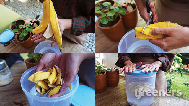 3. Semprotkan potongan pisang dan atau kulitnya dengan rumput laut yang diencerkan. Ini memberikan ‘makanan’ tambahan untuk mikroba yang akan membantu memecah pisang lebih cepat. Sehingga nutrisinya bisa diserap oleh tanaman.