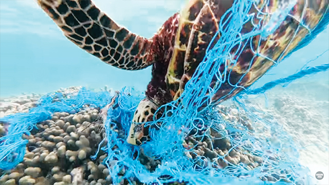 Salah satu cuplikan film Endgame 2050 yang memperlihatkan seekor penyu terjebak di jaring penangkap ikan. Foto: Kanal Youtube Resmi Endgame 2050.