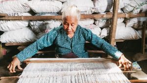 “karena terbuat dari katun lokal ya tenun tangan benang pintal jadi punya daya tahan yang cukup bagus,” ucapnya.