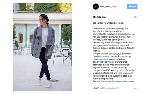Untuk berbagi pengalaman selama tur kepada para penggemarnya, aktris berusia 26 tahun ini membuat akun Instagram khusus, @the_press_tour. Di kanal media sosialnya itu, ia tidak hanya mengisahkan tentang agenda promosinya, namun juga memperkenalkan eco-fashion karya beberapa desainer ternama.