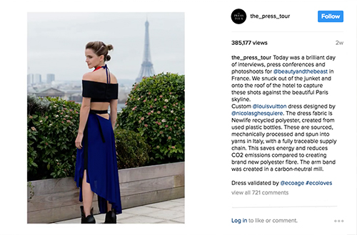 Emma menjelaskan untuk membuat bahan gaun ini, botol-botol dikumpulkan, diproses secara mekanis dan dipintal menjadi benang di satu negara, yaitu Italia. Proses daur ulang ini lebih menghemat energi jika dibandingkan dengan membuat serat polyester baru, sehingga mengurangi emisi karbon dioksida. Sementara itu, kain hitam yang membalut lengan Emma diproduksi di pabrik yang tidak menghasilkan jejak karbon.